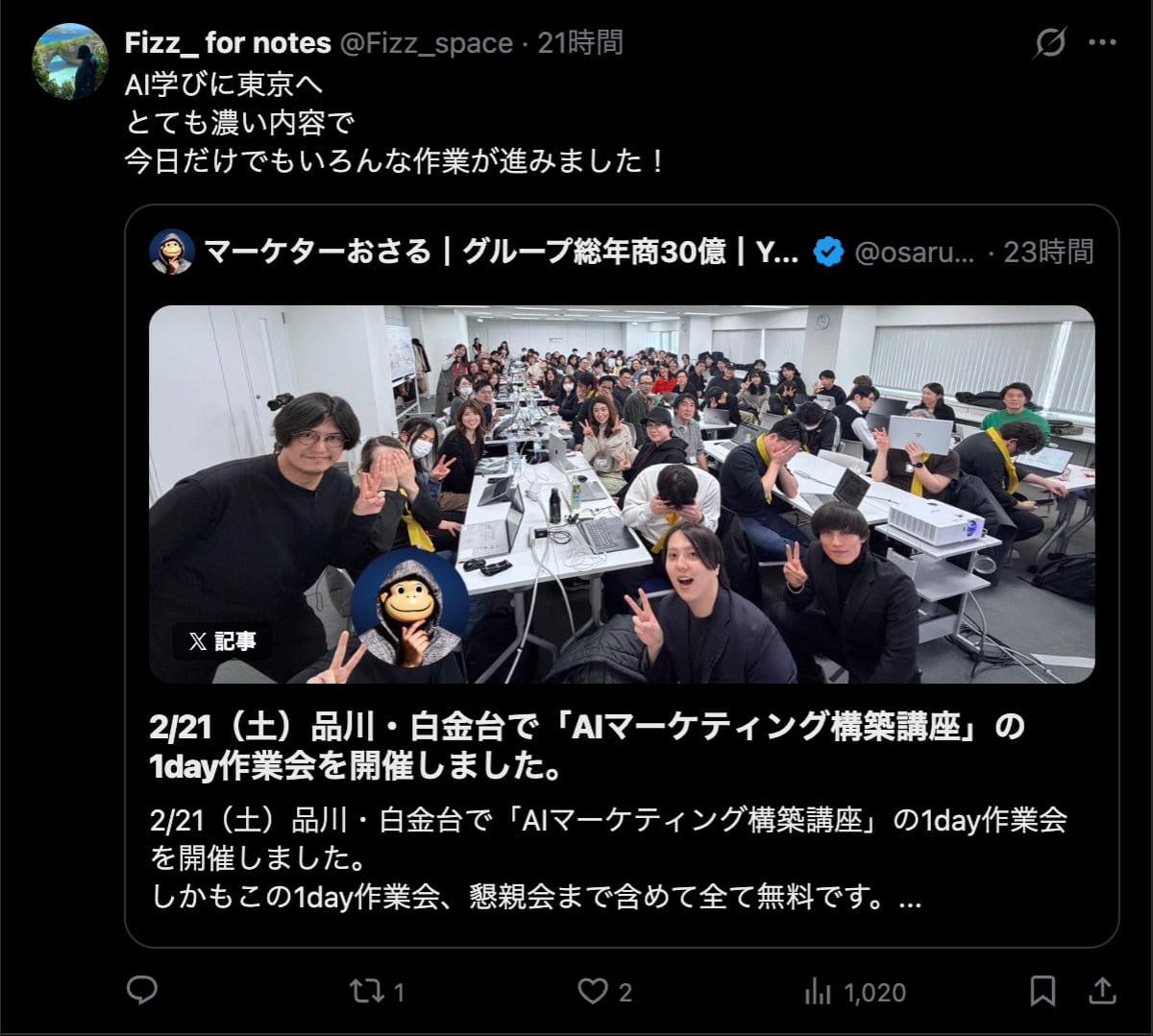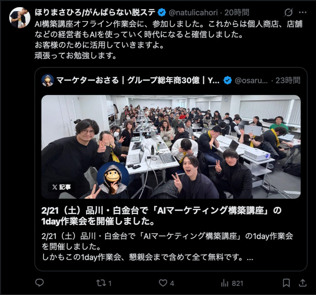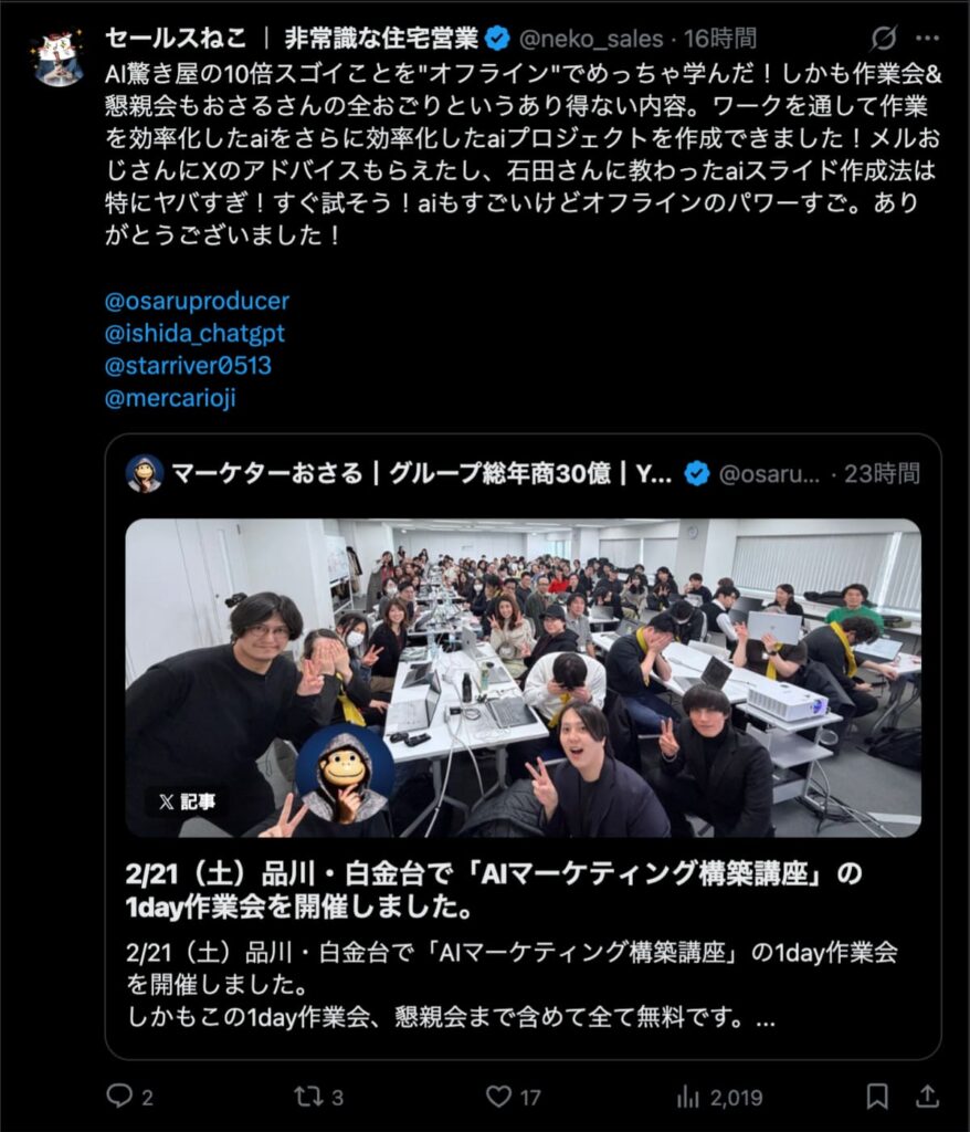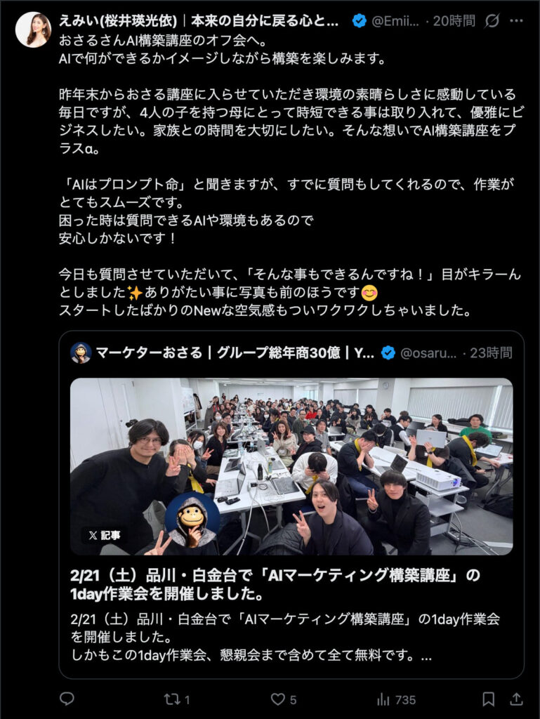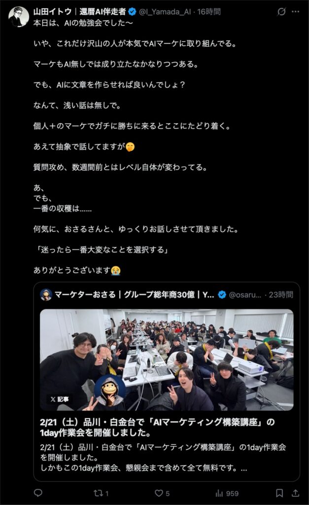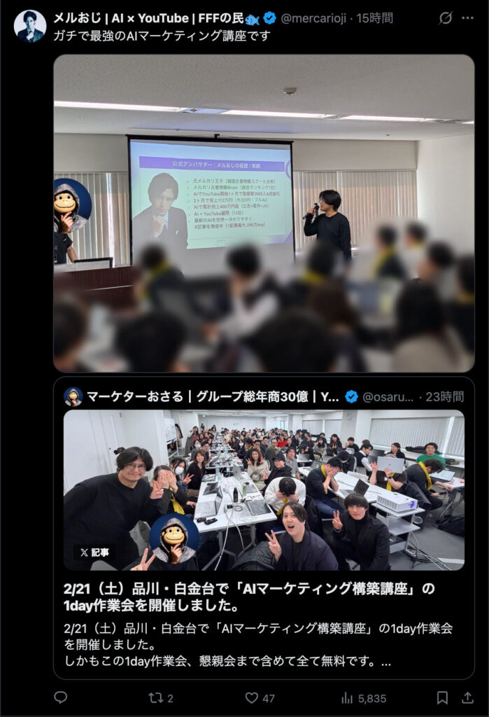 2026年2月21日は、品川・白金台で「AIマーケティング構築講座」の1day作業会を開催しました。この1day作業会は懇親会まで含めて全て無料です。