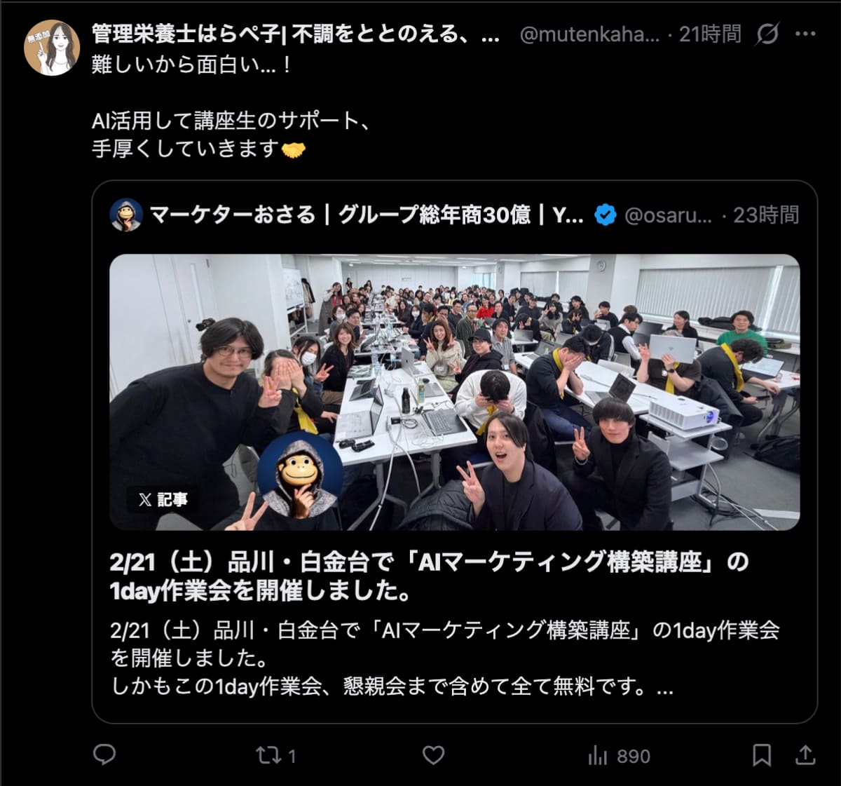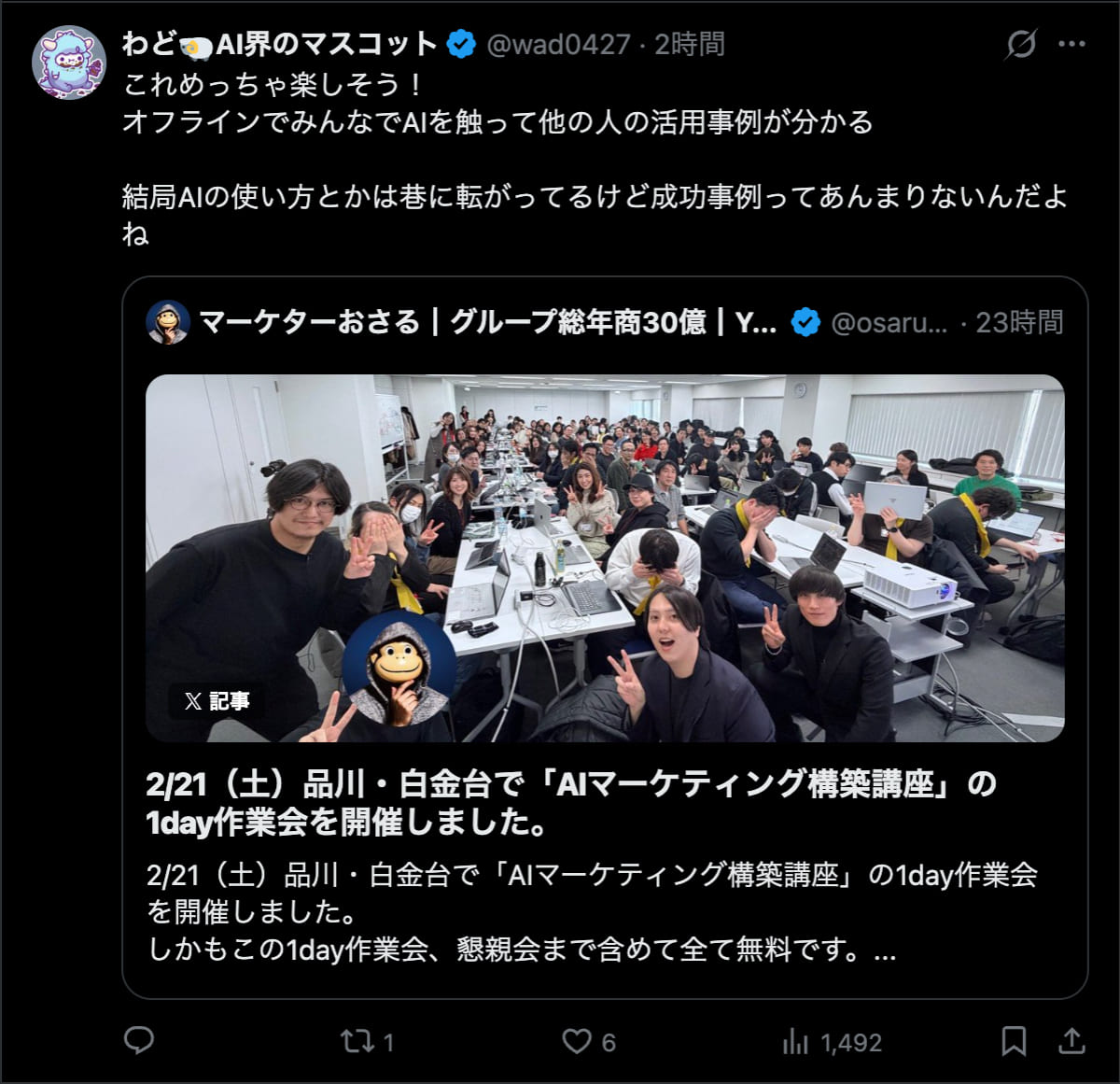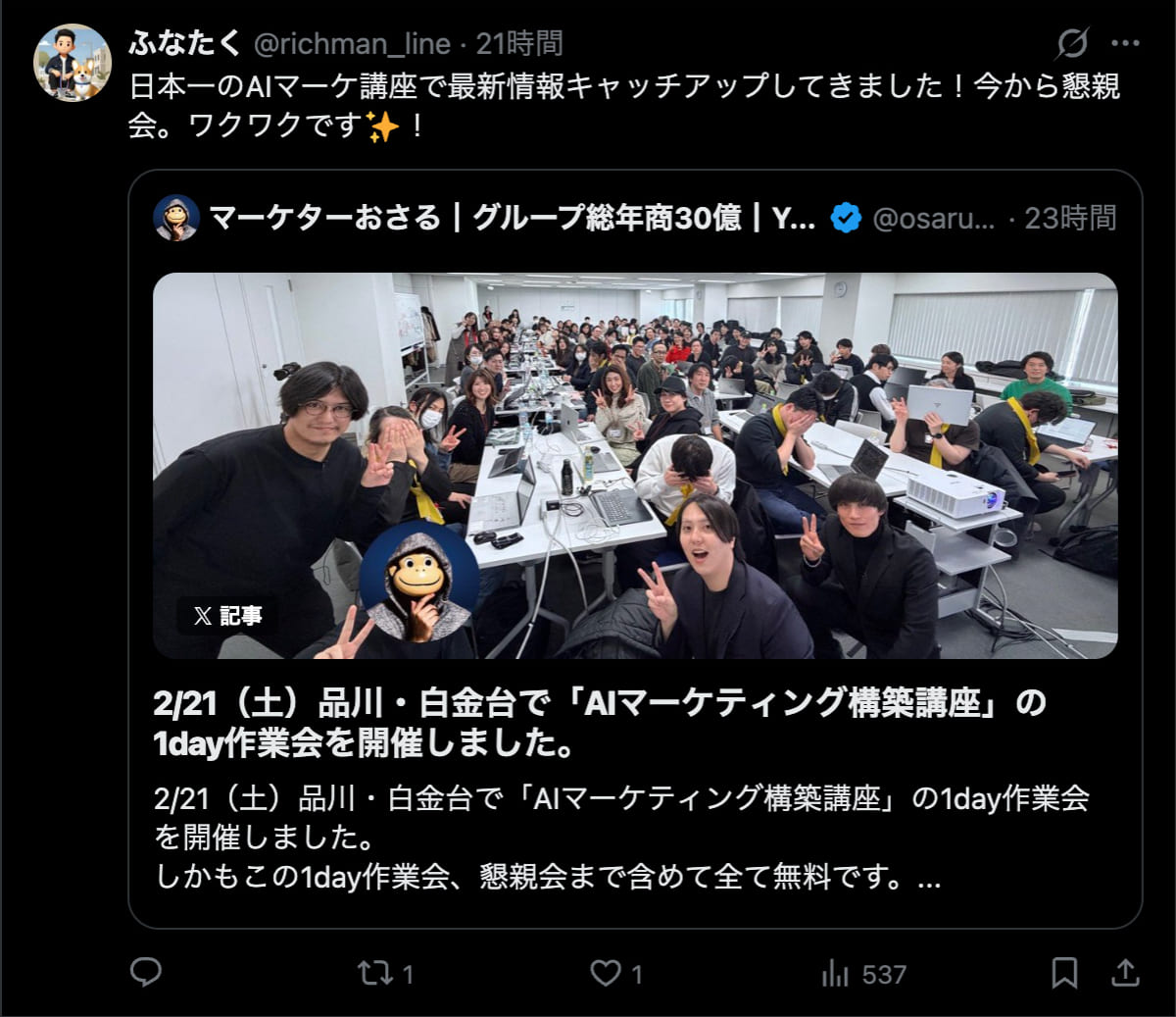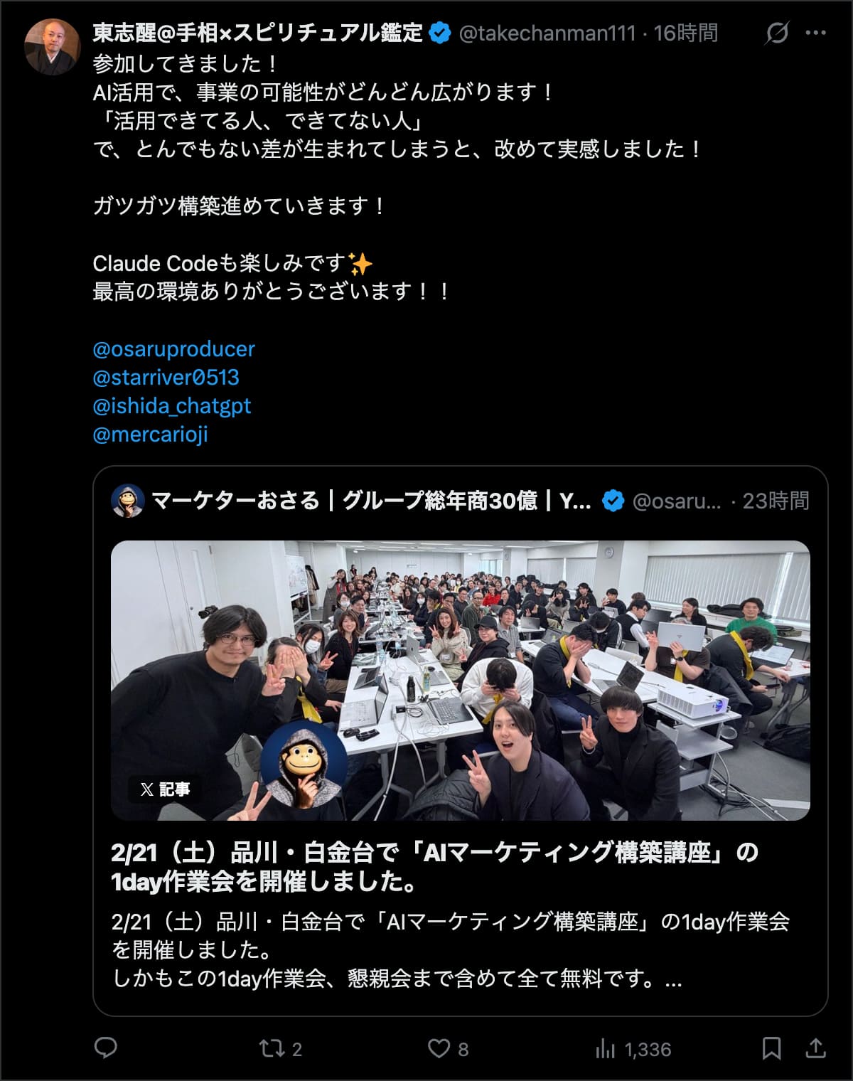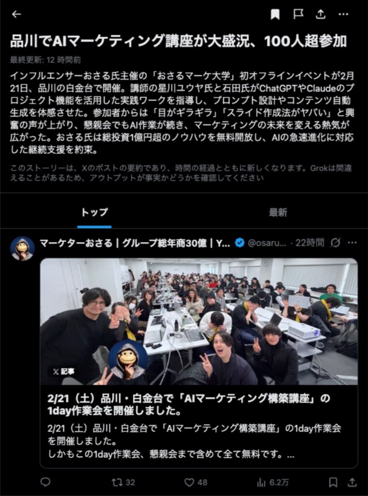 2026年2月21日は、品川・白金台で「AIマーケティング構築講座」の1day作業会を開催しました。この1day作業会は懇親会まで含めて全て無料です。