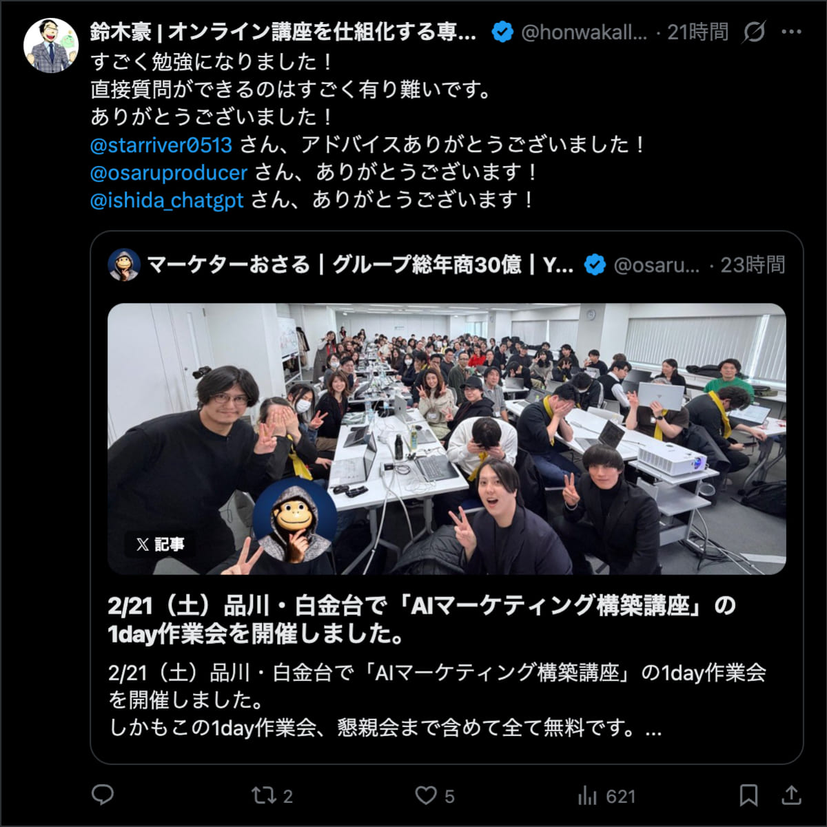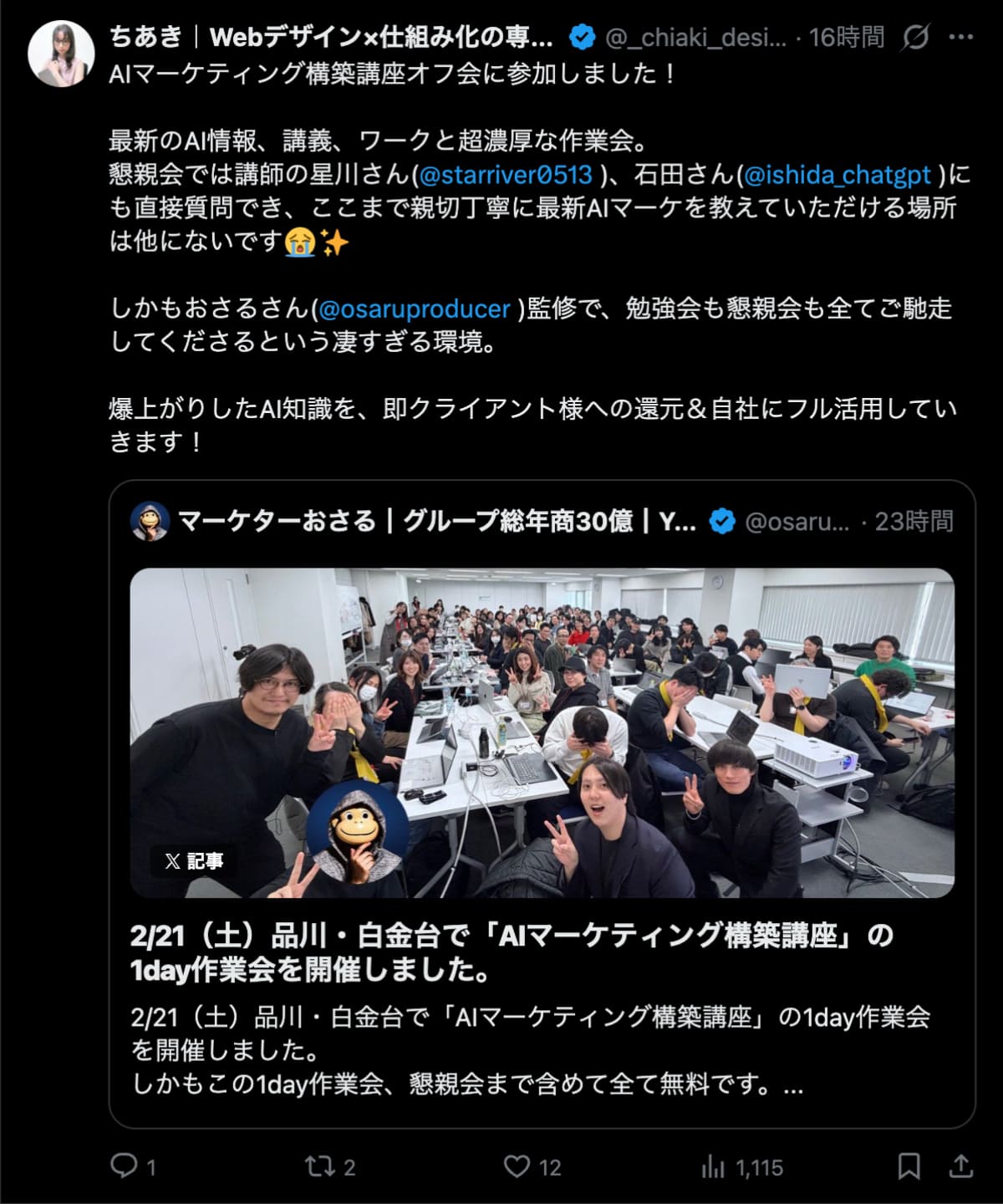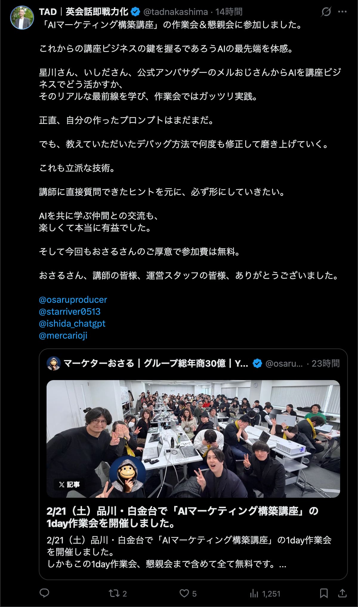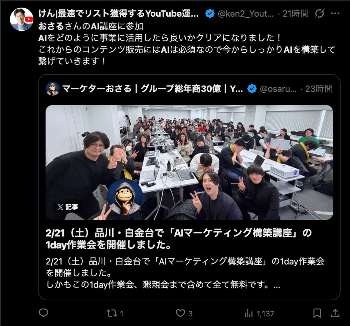 2026年2月21日は、品川・白金台で「AIマーケティング構築講座」の1day作業会を開催しました。この1day作業会は懇親会まで含めて全て無料です。