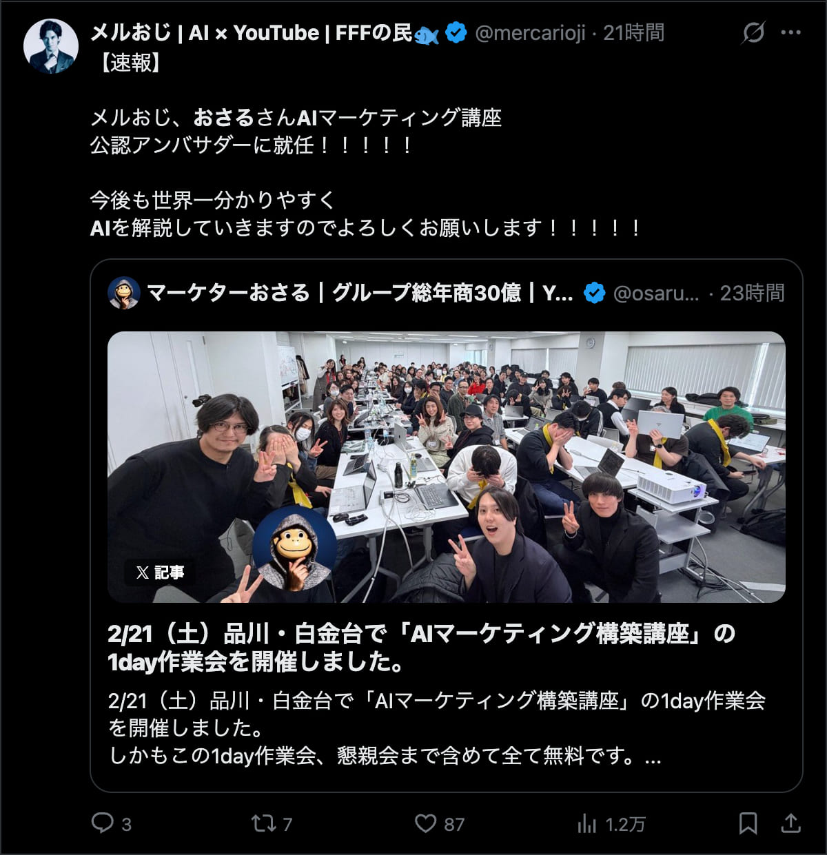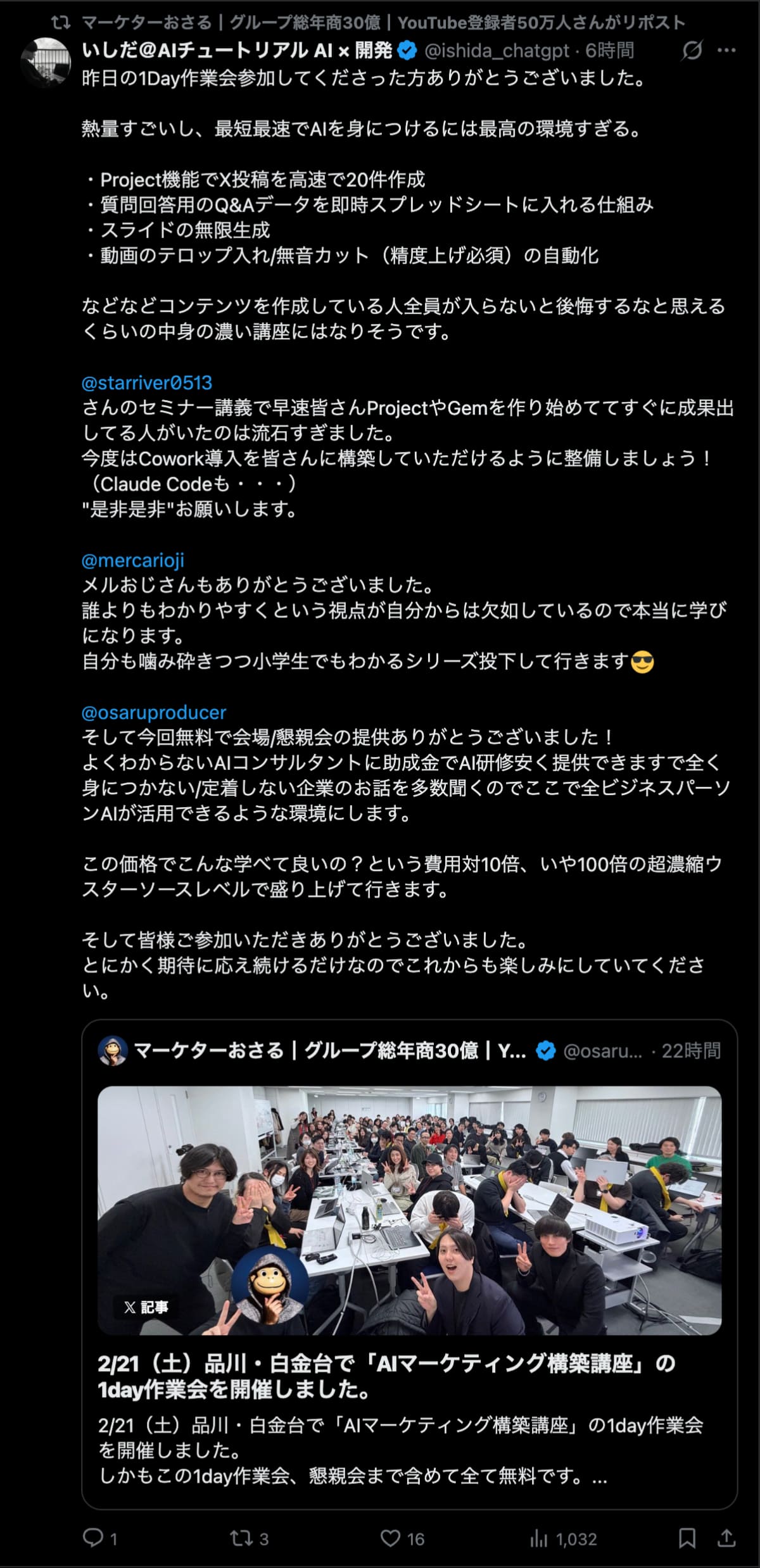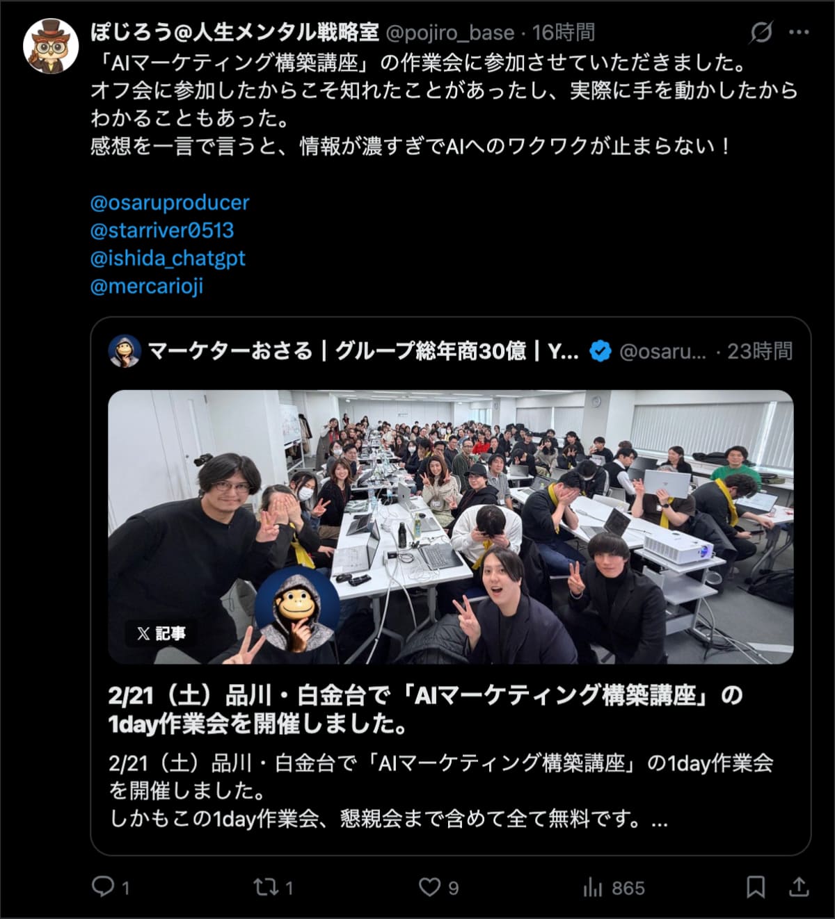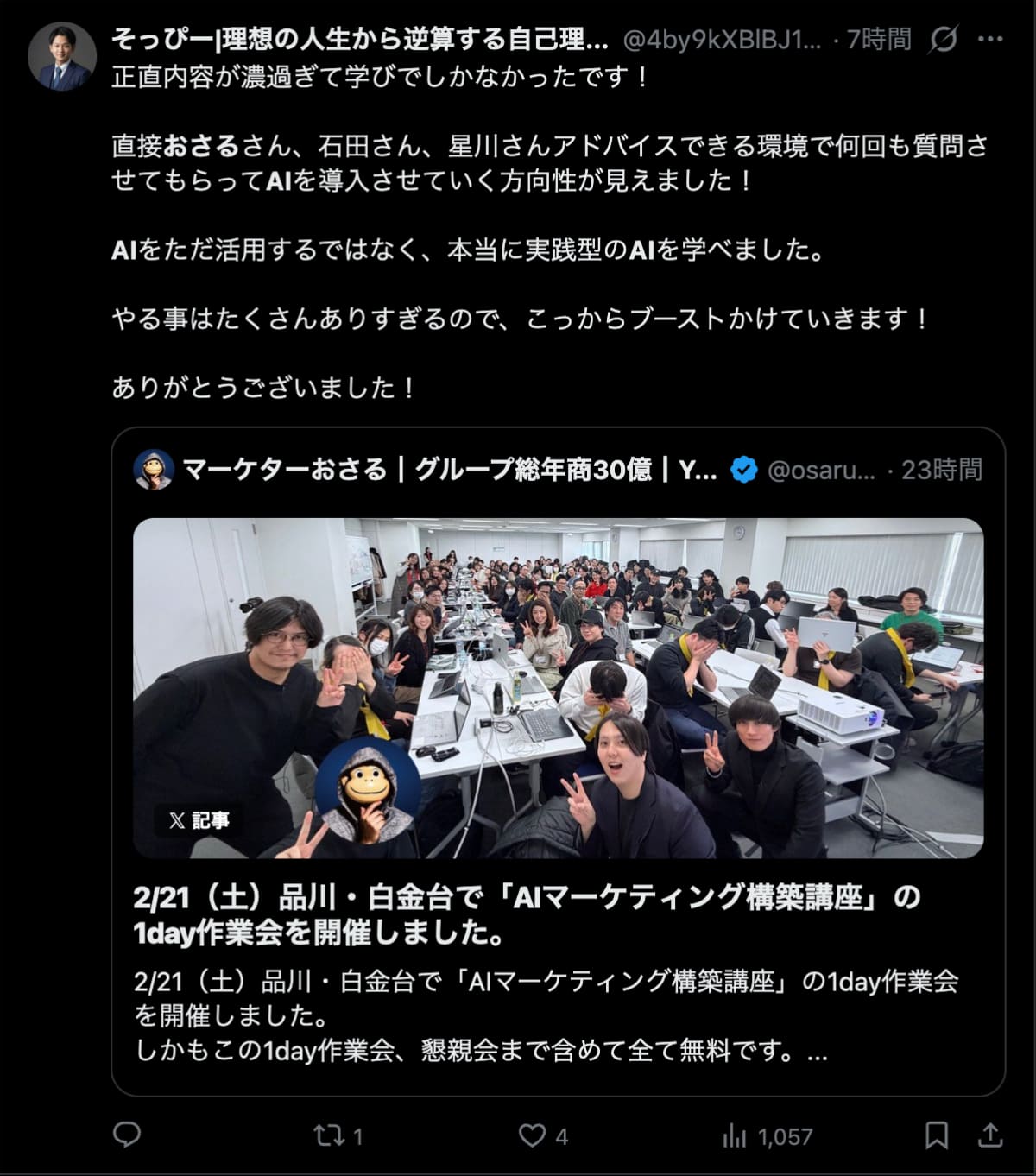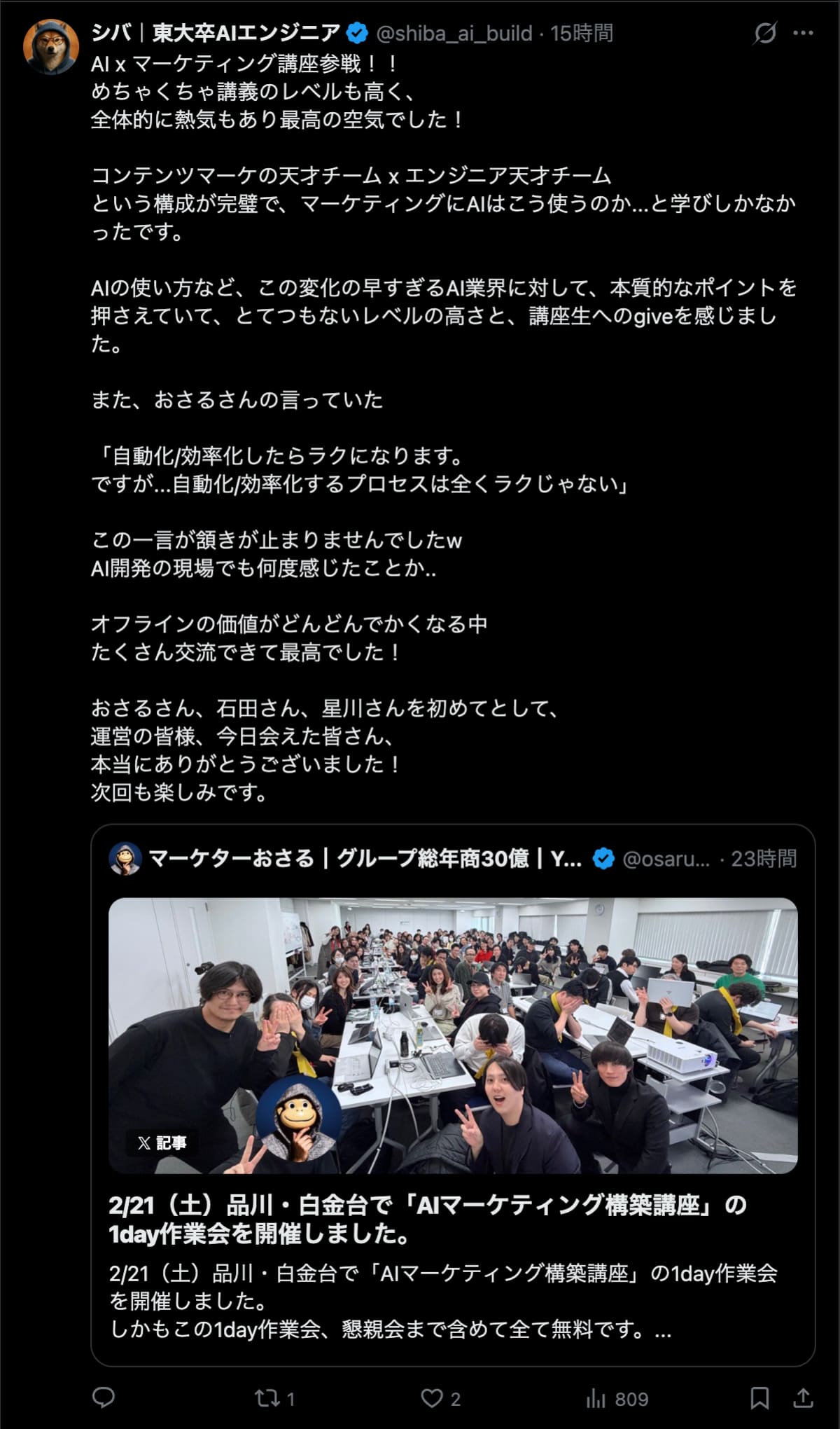 2026年2月21日は、品川・白金台で「AIマーケティング構築講座」の1day作業会を開催しました。この1day作業会は懇親会まで含めて全て無料です。