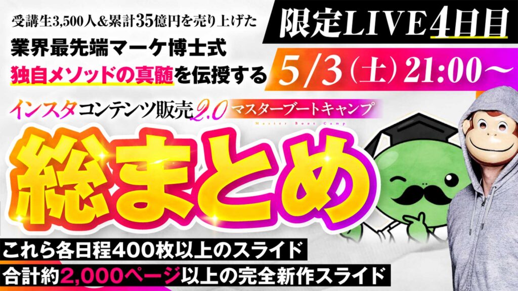 今回はノウハウスライド資料200枚超え & 合計750ページ超えのおさる式 × マーケ博士式インスタ攻略術 & マーケ博士式プランニングマスターシートLITE & 全310講義を格納した特別会員サイトインスタコンテンツ販売マスタープログラムFREEなど
