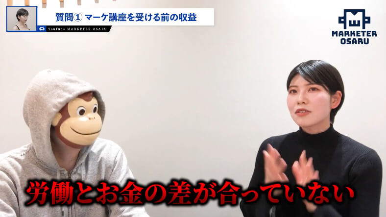 おさる:月1万円だと、いくら労働しても割に合わないという感じだったのですね。講座を受ける前はいろいろなマインドブロックや悩みもあったと思いますが、低単価の商品を売るのには何か理由があったんですか?