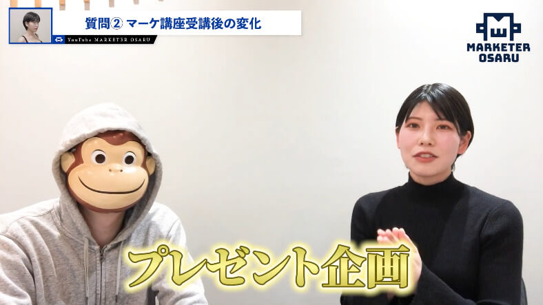 しおりん:私はそこまですごくありません。おさるさんからスライド資料やローンチ・YouTubeの台本などをすべていただけますし、それを自分のやり方に変えて出しただけで、流れも本当にそのまま使わせていただきました。
