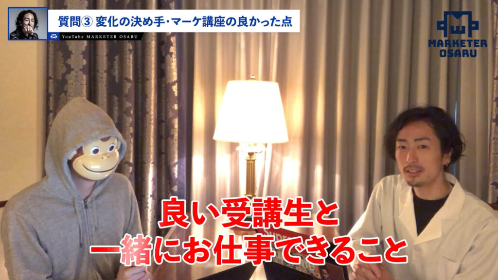 おさる:講座のなかで「環境がよかった」と話してくれていましたが、具体的にはどういう点が影響しましたか?