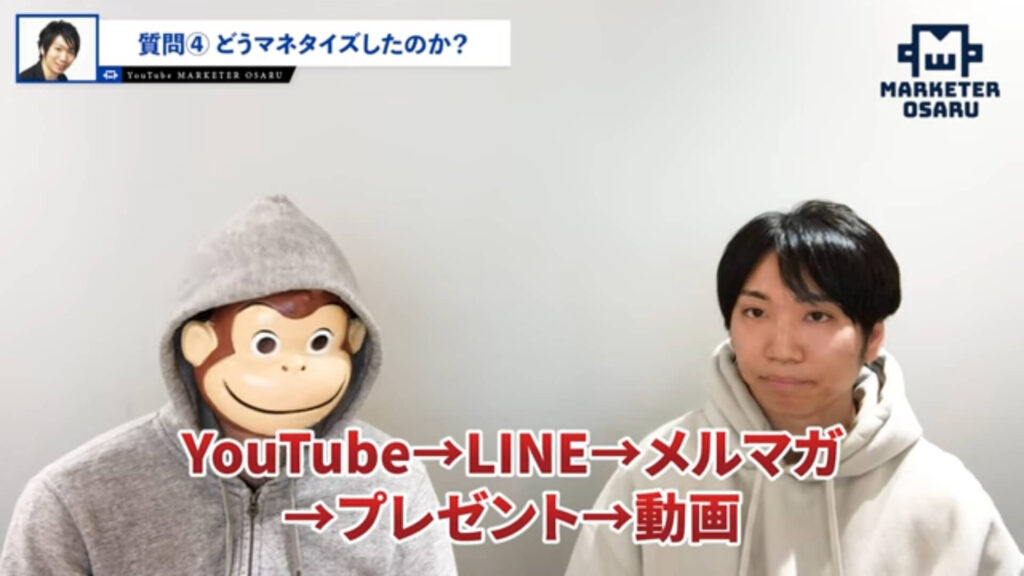 おさる:YouTube → LINE → メルマガ → プレゼント → 動画という感じですね。低単価の商品ですので、毎回毎回セミナーではなくて動画で売り切ってしまう。これはとても素晴らしいです。