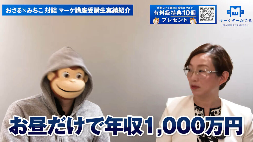 おさる:それが結果につながっているんでしょうね。実際に「お昼1時間だけで年収1,000万」の生徒さんも多いと聞きました。