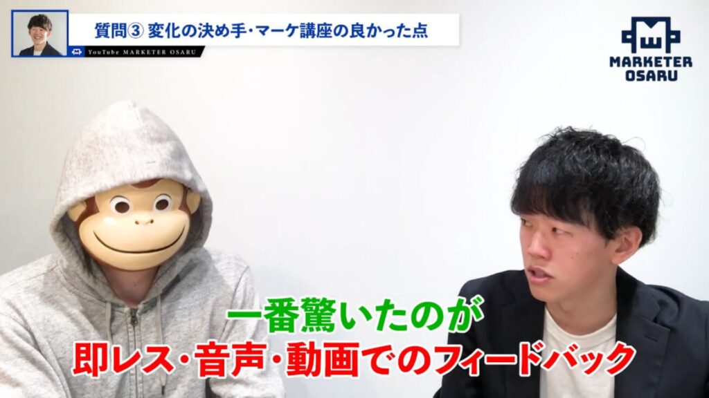 まつつ:一番は、講師であるおさるさんの姿勢です。1人ひとりの受講生への対応の質が、本当にすごかったです。中でも音声や動画でのフィードバックが特に印象的でした。