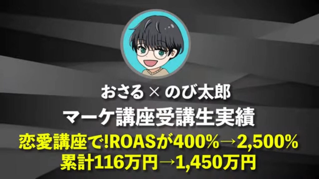 おさる:簡単にのび太郎さんの紹介をさせていただきます。のび太郎さんは恋愛のジャンルで、SNSのフォロワー数はXが253名、Instagramが111名、YouTubeが46名です。今回の動画は、広告をされている方はおさる式のローンチ手法を入れるだけで、とてつもないROASのアップができるということでお話ししていこうと思います。