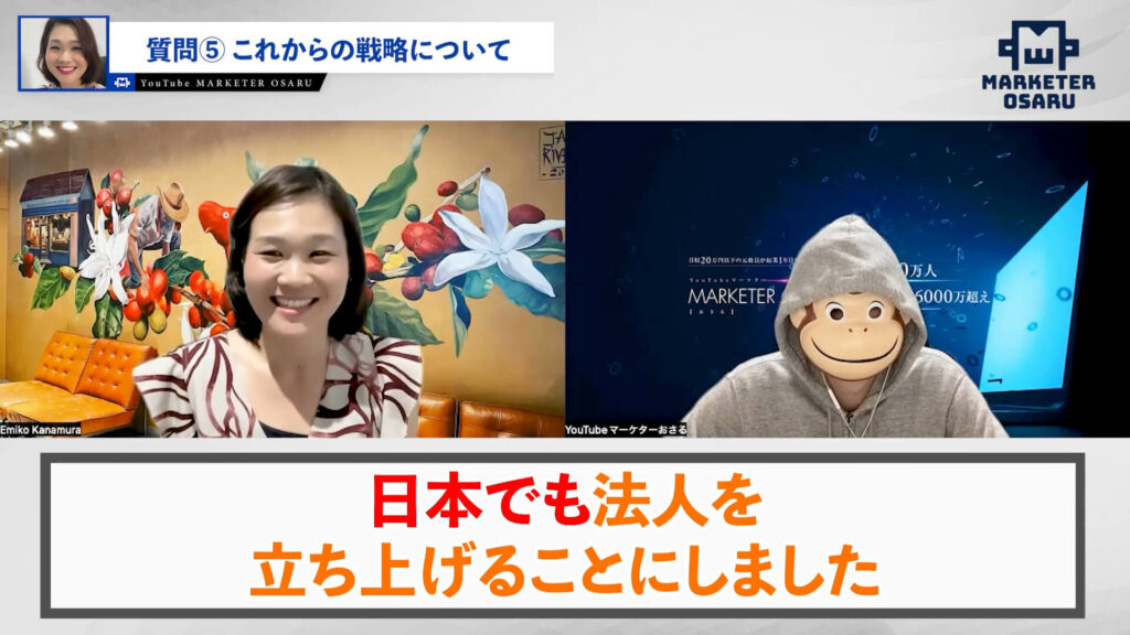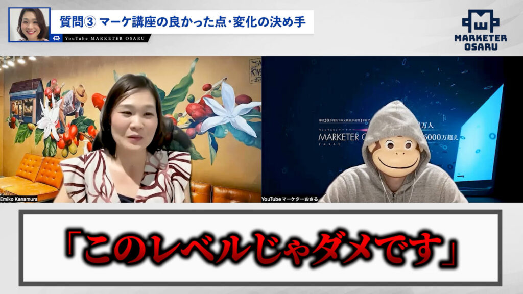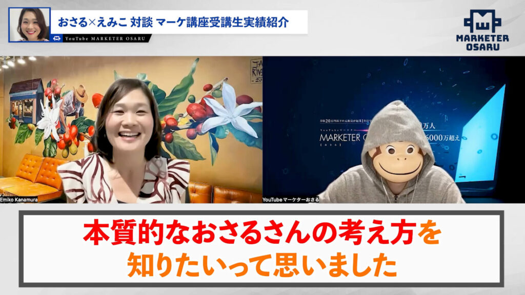 えみこ:はい。それで英語の講座に入って、その後、YouTubeの作り込みや見せ方などを本格的に相談したくて、ちょうどマーケティング講座が始まるタイミングで受講しました。