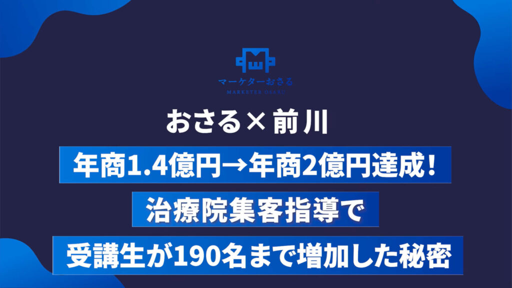 今回登場いただいたのは、治療院業界でマーケティング支援をおこなう前川さん。前回の対談時は年商1.4億円でしたが、そこから大きくジャンプアップし、今回ついに年商2億円を達成。その成功の裏には、どのような変化と取り組みがあったのか、おさる講座との関わり方も含めて深掘りしていきます。