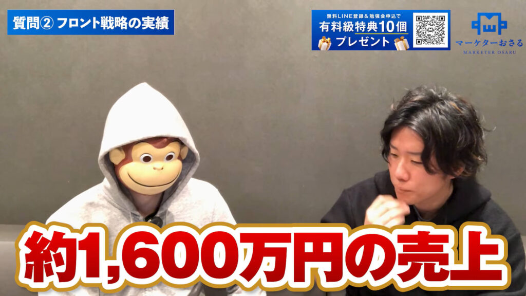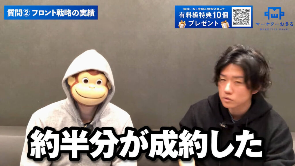 おさる:では、講座の販売モデルについても教えてください。バックエンドとフロント、それぞれどうなっているんですか?