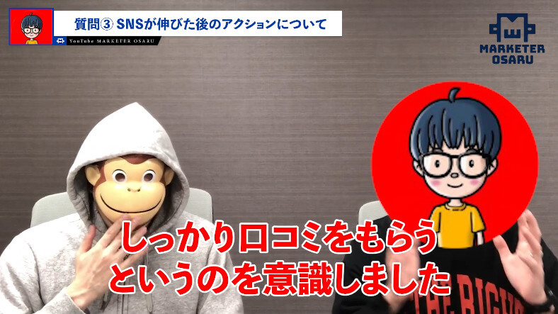おさる:すごいですね。しかも顔出しなしの動画でそこまで成果が出るというのは、かなり希望が持てますね。